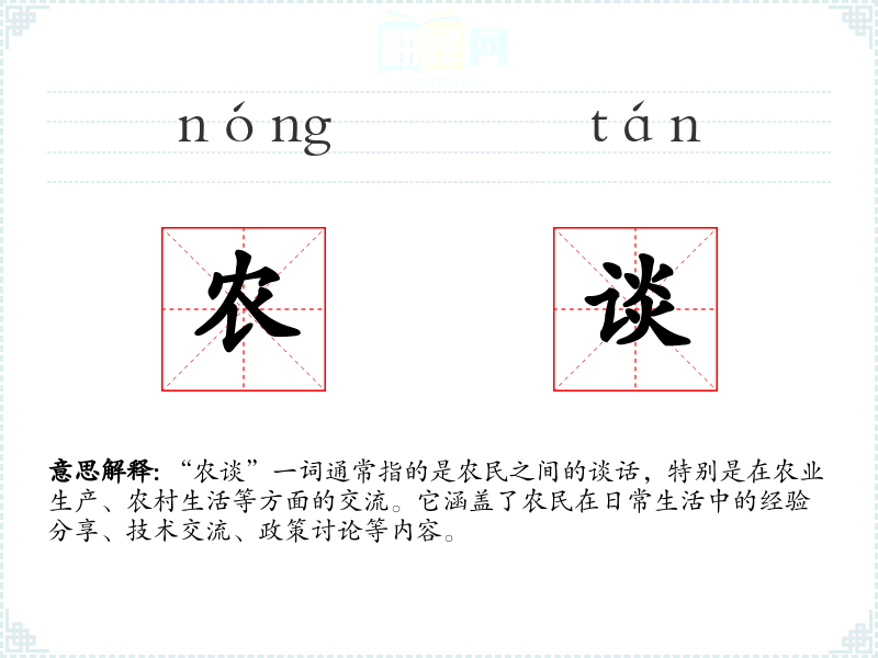- 口语语境:在日常口语中,“农谈”可能指的是农民在田间地头或集市上的随意交谈。