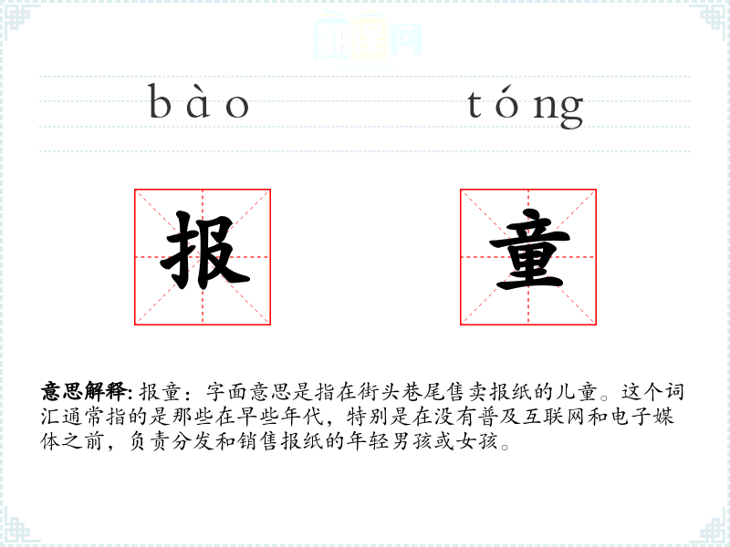 报童:字面意思是指在街头巷尾售卖报纸的儿童。这个词汇通常指的是那些在早些年代,特别是在没有普及互联网和电子媒体之前,负责分发和销售报纸的年轻男孩或女孩。