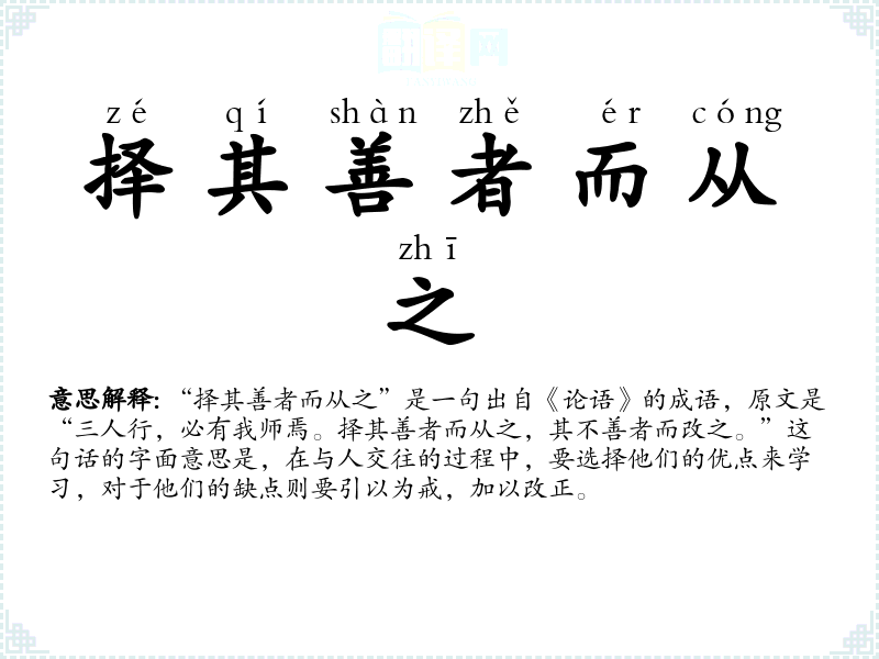 “择其善者而从之”是一句出自《论语》的成语,原文是“三人行,必有我师焉。择其善者而从之,其不善者而改之。”这句话的字面意思是,在与人交往的过程中,要选择他们的优点来学*,对于他们的缺点则要引以为戒,加以改正。