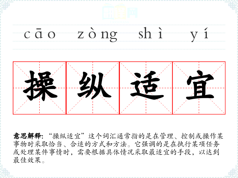 “操纵适宜”这个词汇强调了在各种情境下采取合适方法的重要性。它不仅在专业领域中有着广泛的应用,也在日常生活中提醒我们做出明智的选择。通过学习和应用这个词汇,我更加意识到在面对复杂问题时,选择合适的方法和策略的重要性。