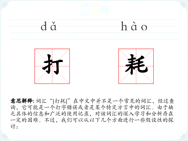 由于“[打耗]”不是一个标准词汇,我们无法给出确切的基本定义。如果它是一个方言词汇,那么它的意思可能会根据具体的地域和文化背景有所不同。