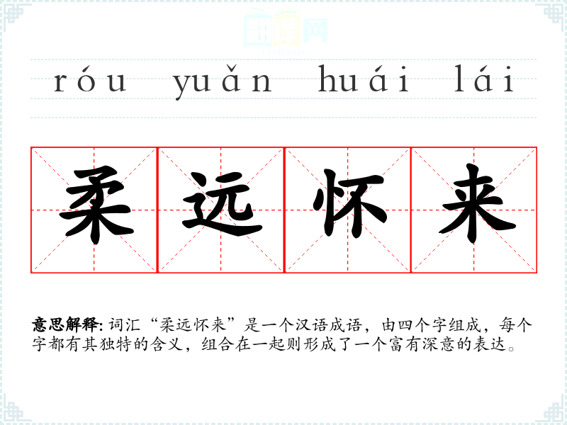 词汇“柔远怀来”是一个汉语成语,由四个字组成,每个字都有其独特的含义,组合在一起则形成了一个富有深意的表达。