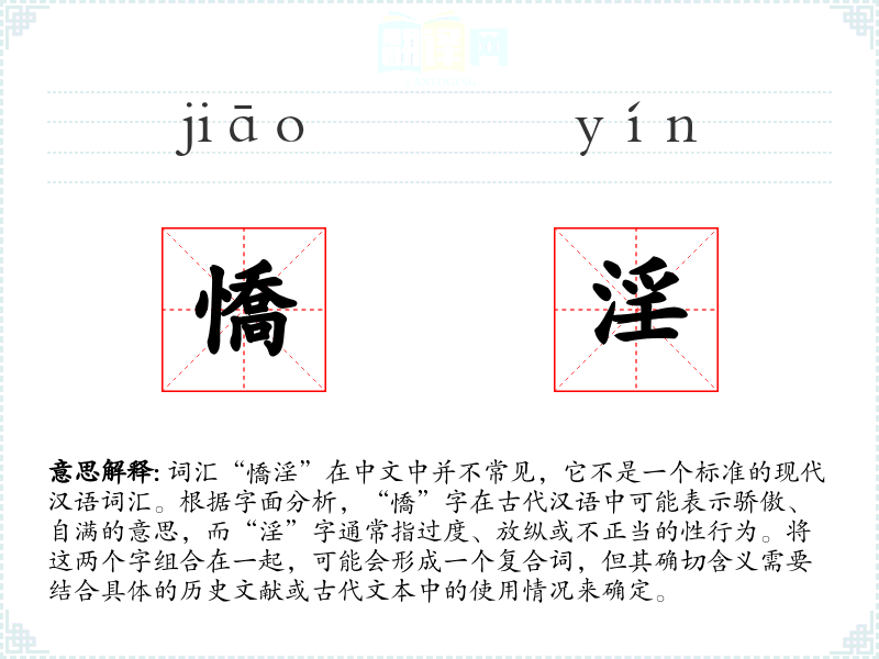 “憍”字可能源自古代汉语,意为骄傲或自满。“淫”字在古代汉语中有多重含义,包括过度、放纵等。这两个字的组合可能在某些古代文献中有所体现,但其具体含义和使用频率需要进一步的历史语言学研究。