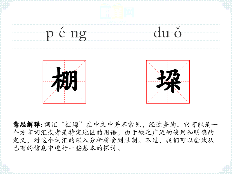 词汇“棚垜”在中文中并不常见,经过查询,它可能是一个方言词汇或者是特定地区的用语。由于缺乏广泛的使用和明确的定义,对这个词汇的深入分析将受到限制。不过,我们可以尝试从已有的信息中进行一些基本的探讨。