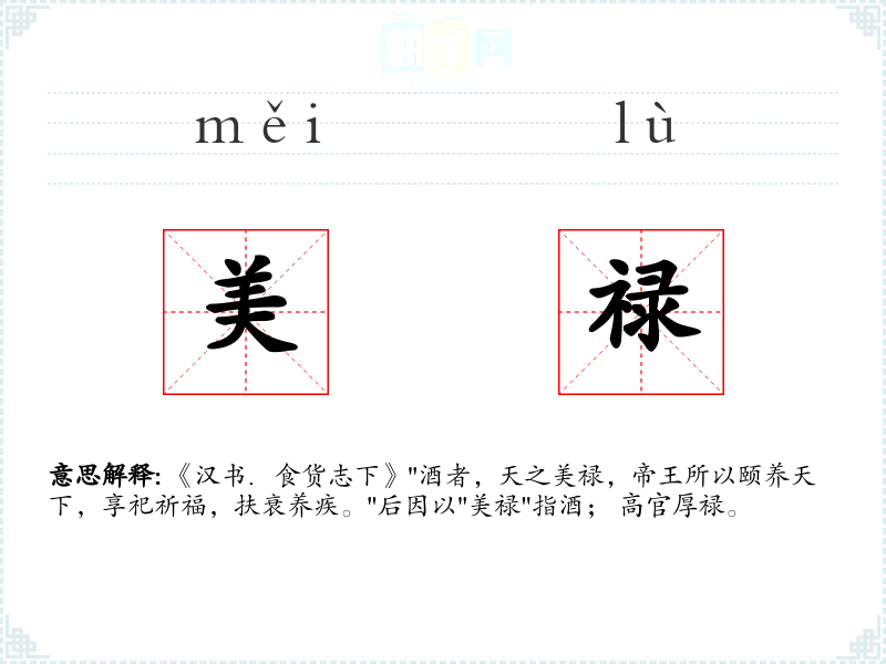 《汉书.食货志下》"酒者,天之美禄,帝王所以颐养天下,享祀祈福,扶衰养疾。"后因以"美禄"指酒;