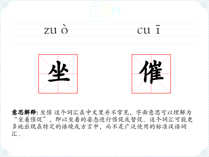 由于坐催不是一个常用词汇,它在不同语言或文化中的对应词汇可能不存在。如果存在类似的表达,可能需要根据具体的文化背景来解释。
