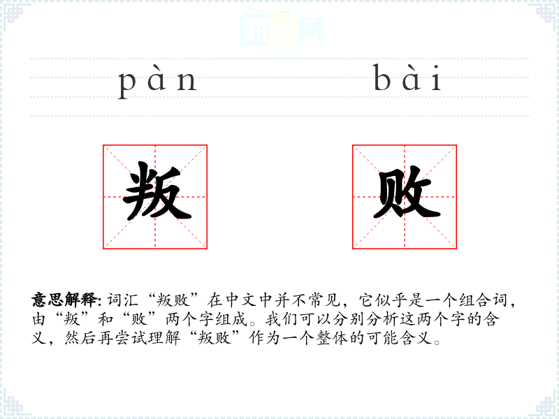 词汇“叛败”在中文中并不常见,它似乎是一个组合词,由“叛”和“败”两个字组成。我们可以分别分析这两个字的含义,然后再尝试理解“叛败”作为一个整体的可能含义。