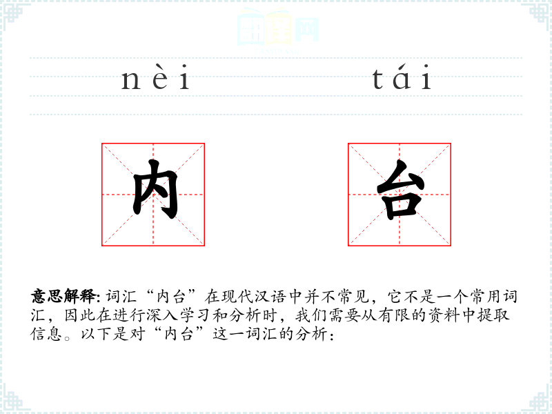 词汇“内台”在现代汉语中并不常见,它不是一个常用词汇,因此在进行深入学*和分析时,我们需要从有限的资料中提取信息。以下是对“内台”这一词汇的分析: