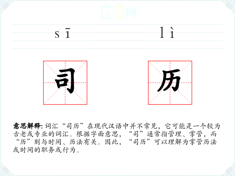 - 词源:“司”来自古代汉语,意为管理;“历”来自古代汉语,意为时间或历法。