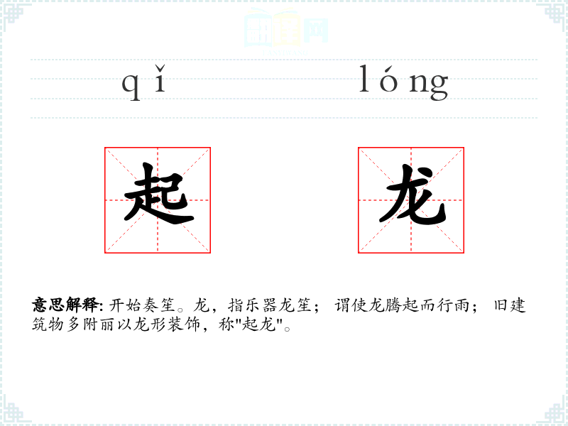 开始奏笙。龙,指乐器龙笙; 谓使龙腾起而行雨; 旧建筑物多附丽以龙形装饰,称"起龙"。