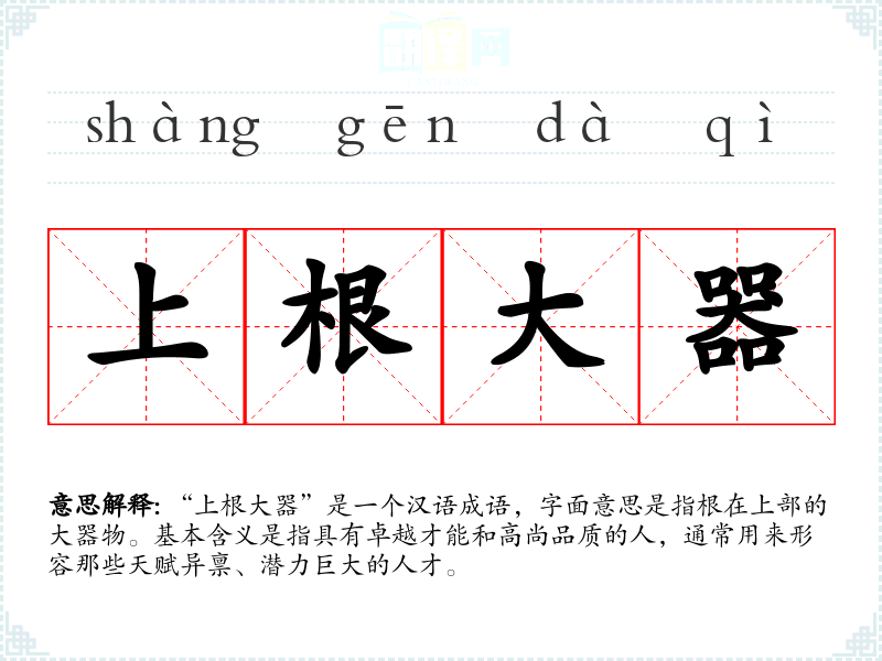 “上根大器”是一个汉语成语,字面意思是指根在上部的大器物。基本含义是指具有卓越才能和高尚品质的人,通常用来形容那些天赋异禀、潜力巨大的人才。