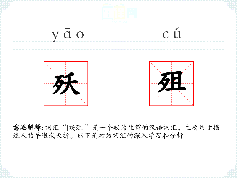 词汇“[殀殂]”是一个较为生僻的汉语词汇,主要用于描述人的早逝或夭折。以下是对该词汇的深入学*和分析: