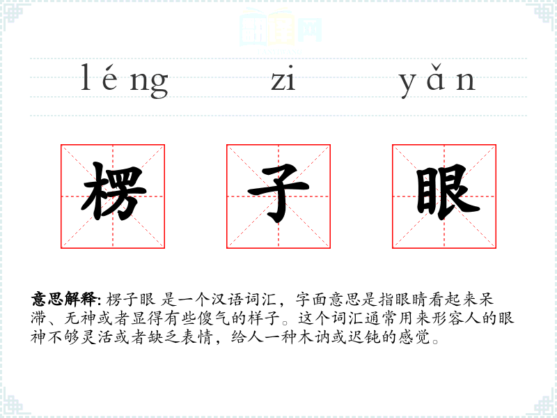 楞子眼 的词源可能来自于方言,其中“楞子”在某些方言中指的是木头或者木讷的意思,而“眼”则是指眼睛。随着时间的推移,这个词汇逐渐被普通话吸收,用来形容人的眼神状态。