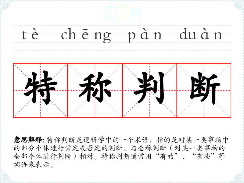 特称判断是逻辑学中的一个术语,指的是对某一类事物中的部分个体进行肯定或否定的判断。与全称判断(对某一类事物的全部个体进行判断)相对。特称判断通常用“有的”、“有些”等词语来表示。