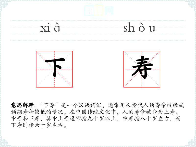 “下寿”这个词汇不仅反映了*人对寿命的传统分类,也承载了对生命短暂和时间流逝的深刻思考。在语言学和表达中,了解这样的词汇有助于更好地理解文化背景和情感表达。