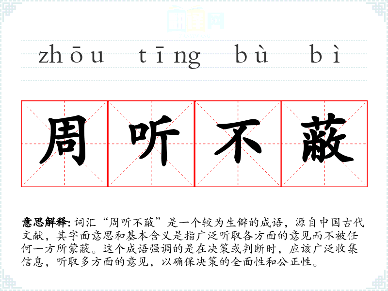 词汇“周听不蔽”是一个较为生僻的成语,源自**古代文献,其字面意思和基本含义是指广泛听取各方面的意见而不被任何一方所蒙蔽。这个成语强调的是在决策或判断时,应该广泛收集信息,听取多方面的意见,以确保决策的全面性和公正性。