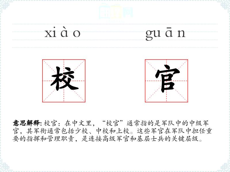 校官:在中文里,“校官”通常指的是军队中的中级军官,其军衔通常包括少校、中校和上校。这些军官在军队中担任重要的指挥和管理职责,是连接高级军官和基层士兵的关键层级。