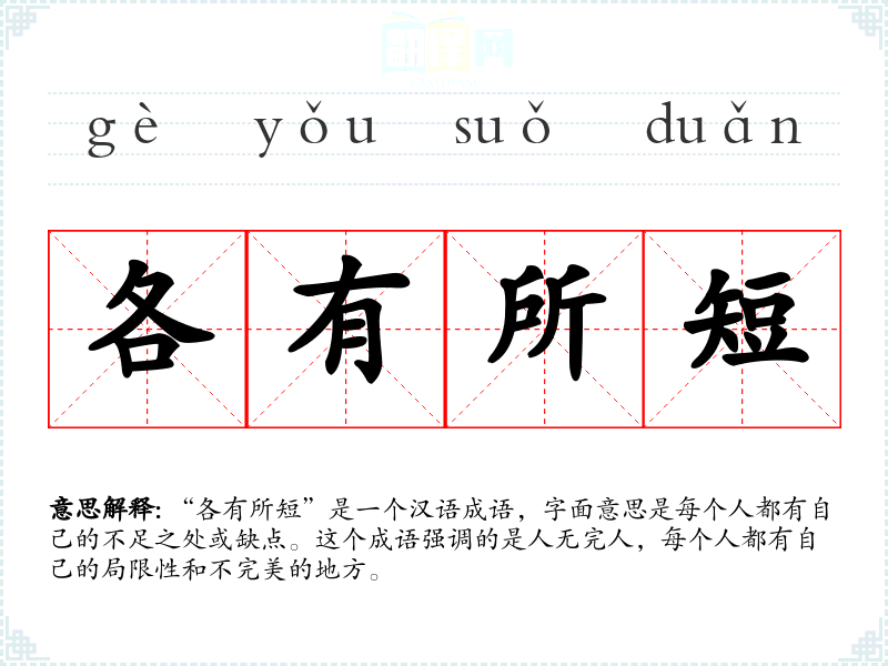 “各有所短”是一个汉语成语,字面意思是每个人都有自己的不足之处或缺点。这个成语强调的是人无完人,每个人都有自己的局限性和不完美的地方。