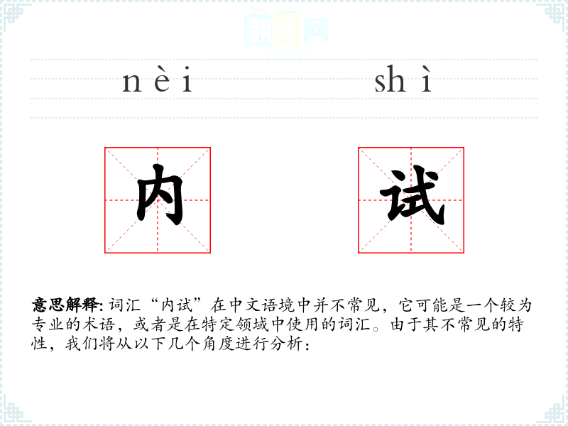 “内试”作为一个专业或特定领域的词汇,其使用范围有限。了解其基本含义和用法,有助于在相关语境中准确理解和使用。在语言学习和表达中,掌握这类特定词汇可以增强专业交流的能力。