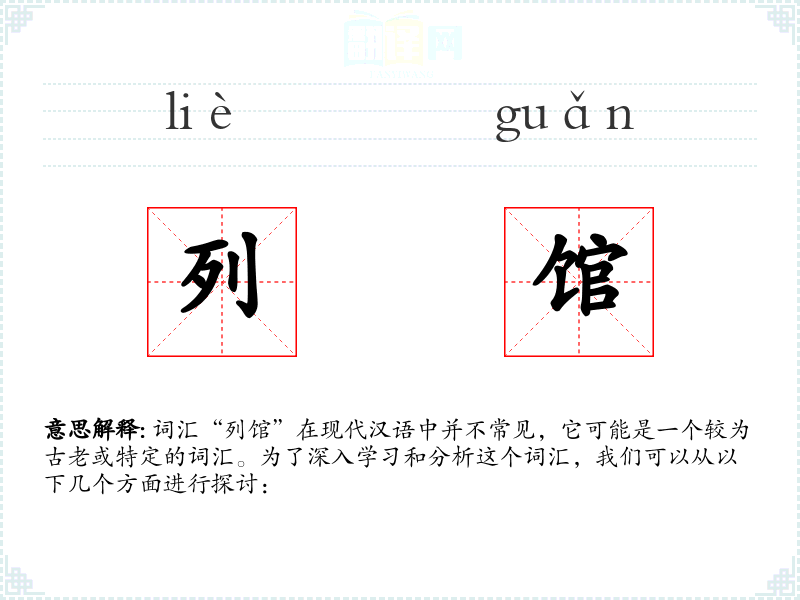 词汇“列馆”在现代汉语中并不常见,它可能是一个较为古老或特定的词汇。为了深入学*和分析这个词汇,我们可以从以下几个方面进行探讨: