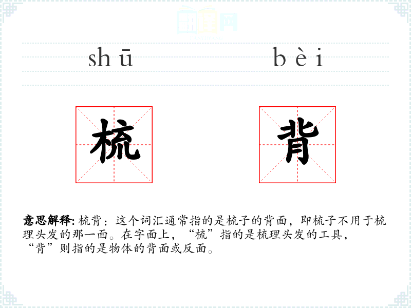 梳背:这个词汇通常指的是梳子的背面,即梳子不用于梳理头发的那一面。在字面上,“梳”指的是梳理头发的工具,“背”则指的是物体的背面或反面。