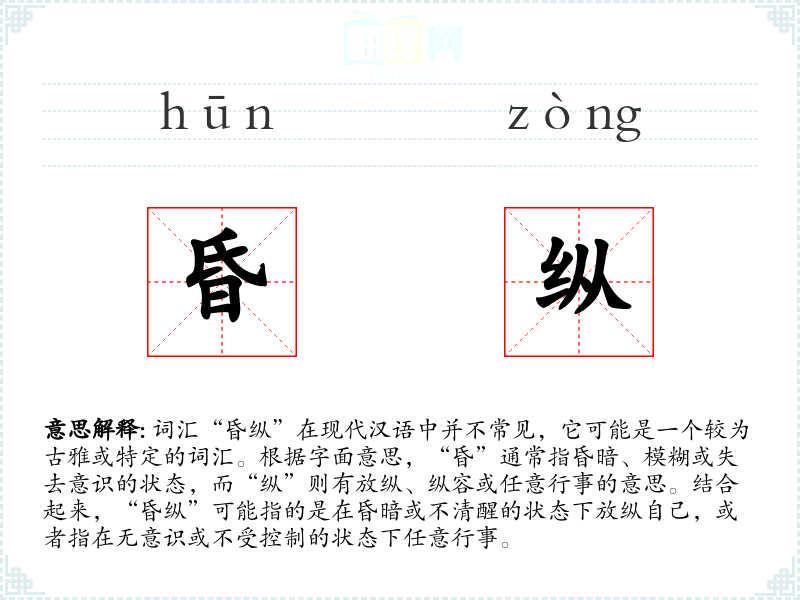 - 词源:“昏”和“纵”都是古代汉语中的常用字,组合起来形成了一个较为古雅的词汇。
