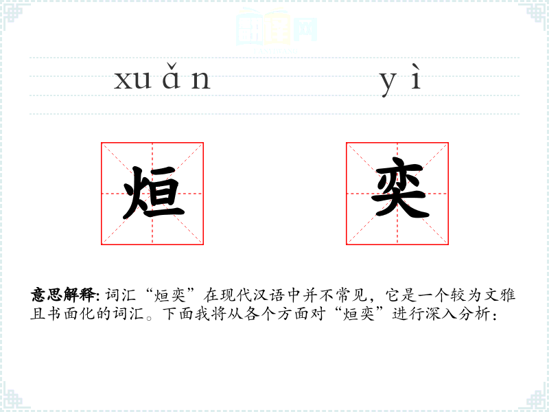 词汇“烜奕”在现代汉语中并不常见,它是一个较为文雅且书面化的词汇。下面我将从各个方面对“烜奕”进行深入分析: