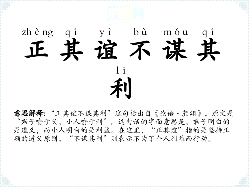 “正其谊不谋其利”这句话出自《论语·颜渊》,原文是“君子喻于义,小人喻于利”。这句话的字面意思是,君子明白的是道义,而小人明白的是利益。在这里,“正其谊”指的是坚持正确的道义原则,“不谋其利”则表示不为了个人利益而行动。