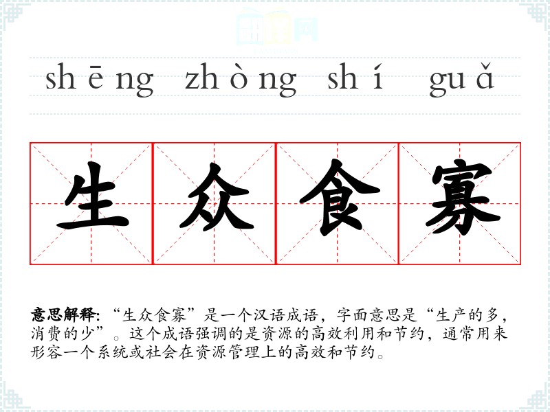 “生众食寡”是一个汉语成语,字面意思是“生产的多,消费的少”。这个成语强调的是资源的高效利用和节约,通常用来形容一个系统或社会在资源管理上的高效和节约。