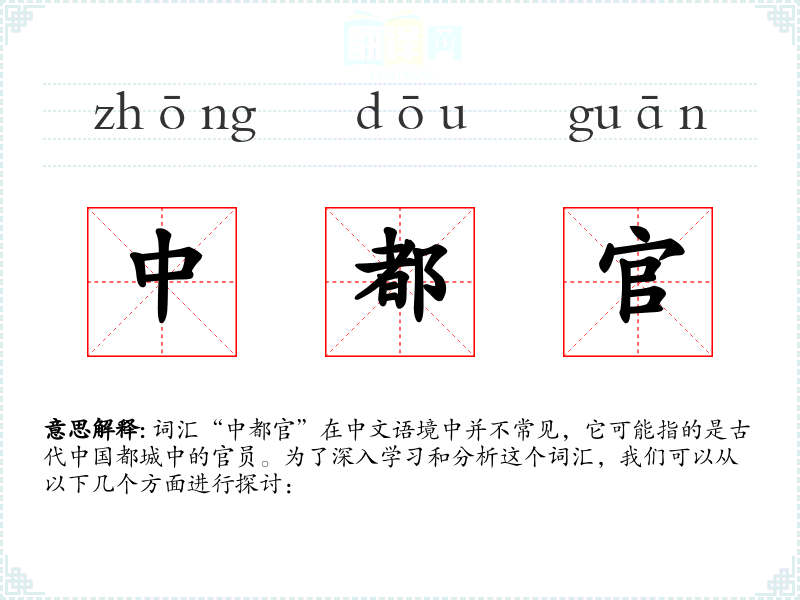 “中都官”是一个具有历史和文化深度的词汇,它不仅反映了古代*的官制体系,也提供了对古代都城生活和官员职责的洞察。在语言学和表达中,了解这样的词汇有助于丰富我们的历史知识和文化素养。