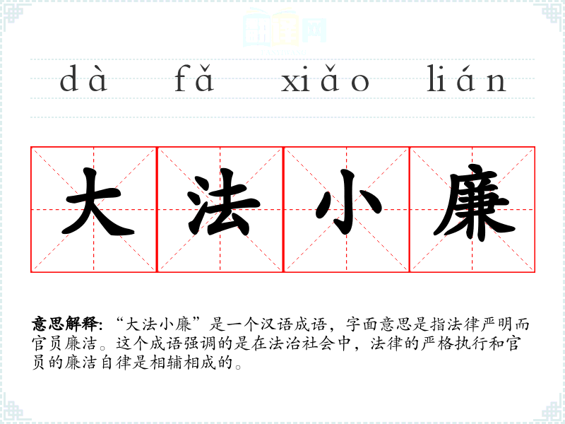 “大法小廉”是一个汉语成语,字面意思是指法律严明而官员廉洁。这个成语强调的是在法治社会中,法律的严格执行和官员的廉洁自律是相辅相成的。