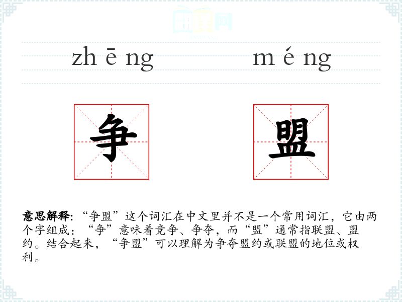 “争盟”这个词汇在中文里并不是一个常用词汇,它由两个字组成:“争”意味着竞争、争夺,而“盟”通常指联盟、盟约。结合起来,“争盟”可以理解为争夺盟约或联盟的地位或权利。
