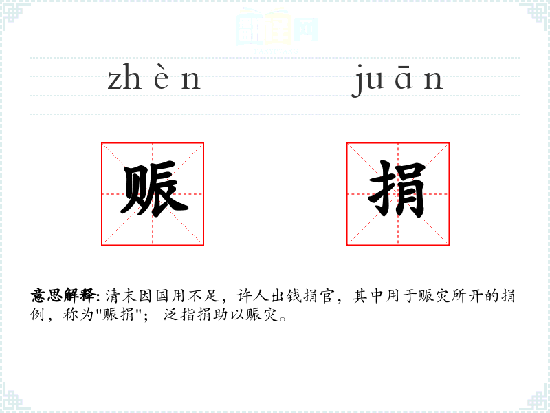 清末因国用不足,许人出钱捐官,其中用于赈灾所开的捐例,称为"赈捐"; 泛指捐助以赈灾。