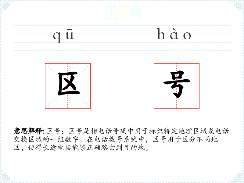 - 反义词:无直接反义词,但可以与“本地号码”相对比,本地号码不包含区号,用于同一地区内的通信。