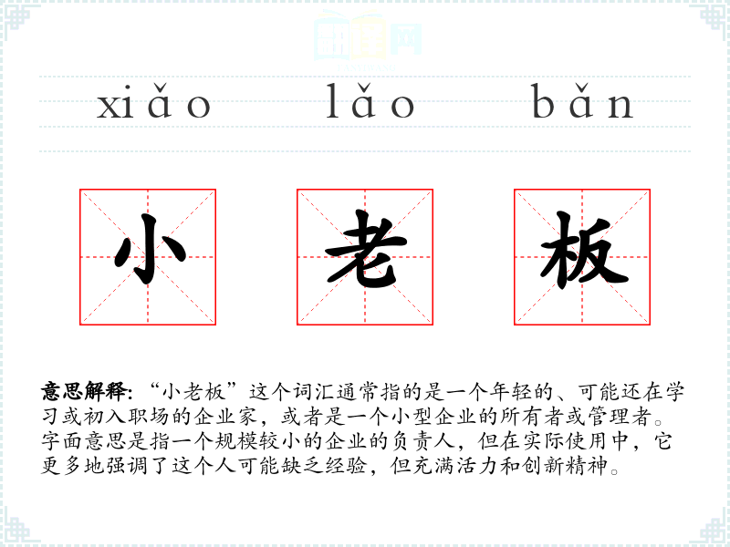 “小老板”这个词汇通常指的是一个年轻的、可能还在学习或初入职场的企业家,或者是一个小型企业的所有者或管理者。字面意思是指一个规模较小的企业的负责人,但在实际使用中,它更多地强调了这个人可能缺乏经验,但充满活力和创新精神。