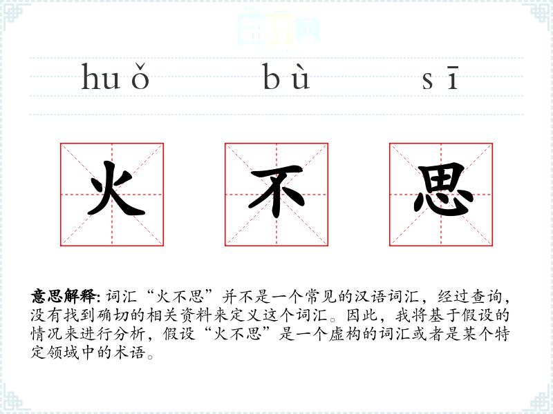 词汇“火不思”并不是一个常见的汉语词汇,经过查询,没有找到确切的相关资料来定义这个词汇。因此,我将基于假设的情况来进行分析,假设“火不思”是一个虚构的词汇或者是某个特定领域中的术语。