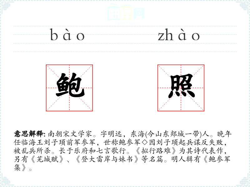 1.南朝宋文学家。字明远,东海(今山东郯城一带)人。晚年任临海王刘子顼前军参军,世称鲍参军◇因刘子顼起兵谋反失败,被乱兵所杀。长于乐府和七言歌行。《拟行路难》为其诗代表作,另有《芜城赋》、《登大雷岸与妹书》等名篇。明人辑有《鲍参军集》。