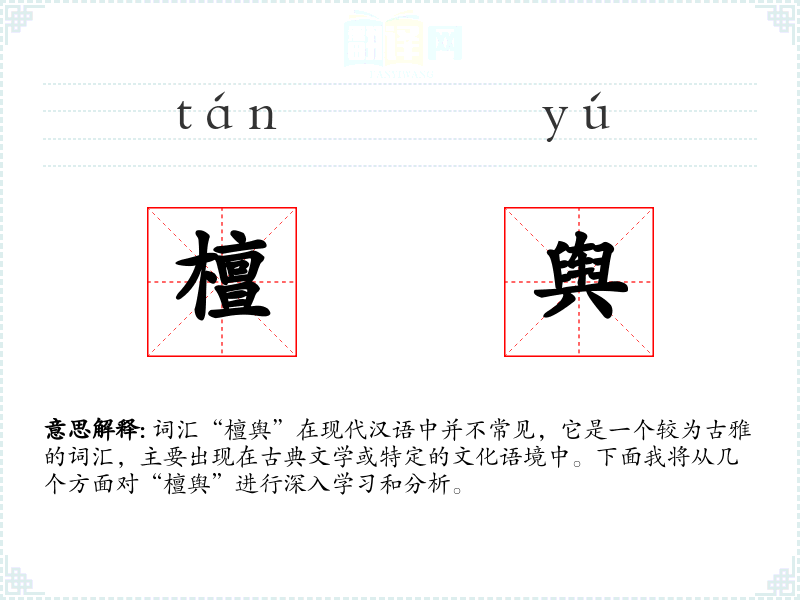 “檀舆”是一个具有古典美和文化内涵的词汇,虽然在现代汉语中不常见,但在文学创作和历史研究中仍有其独特的价值。了解和掌握这个词汇,有助于更深入地理解**古代文化和语言的丰富性。