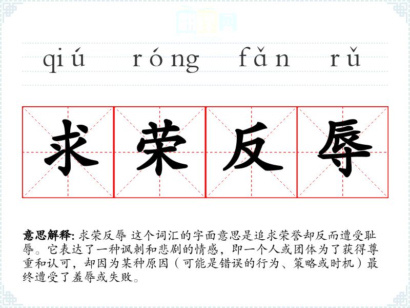 求荣反辱 这个词汇的字面意思是追求荣誉却反而遭受耻辱。它表达了一种讽刺和悲剧的情感,即一个人或团体为了获得尊重和认可,却因为某种原因(可能是错误的行为、策略或时机)最终遭受了羞辱或失败。