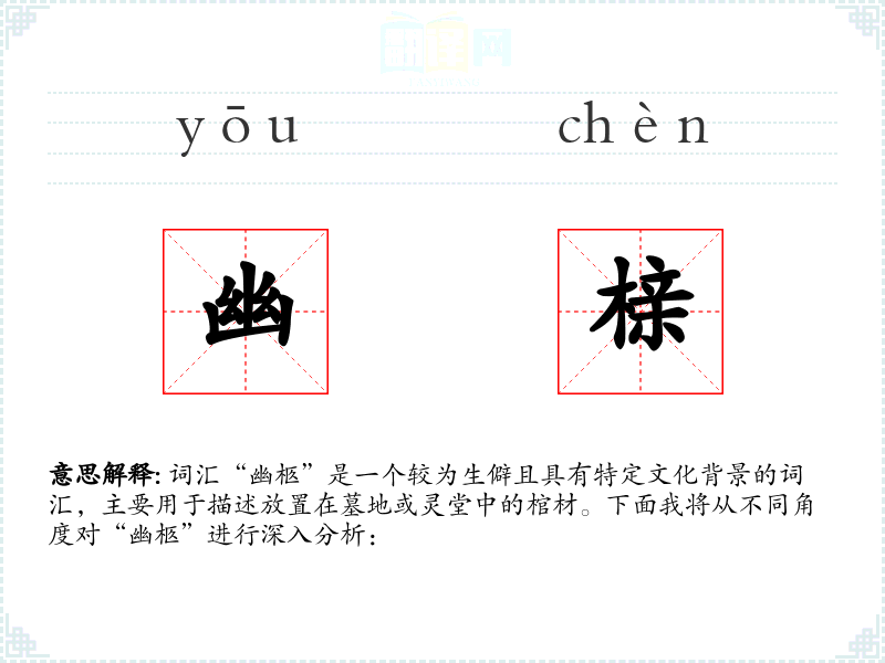 词汇“幽柩”是一个较为生僻且具有特定文化背景的词汇,主要用于描述放置在墓地或灵堂中的棺材。下面我将从不同角度对“幽柩”进行深入分析: