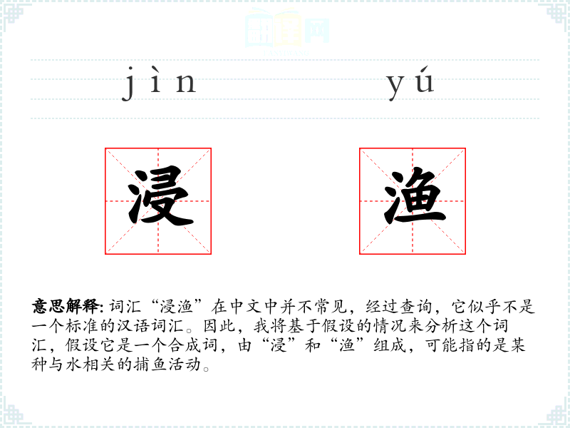 - 由于“浸渔”不是一个标准词汇,其词源和演变不详。假设它是由“浸”和“渔”两个字组合而成,可能是在某个地区或特定群体中形成的词汇。