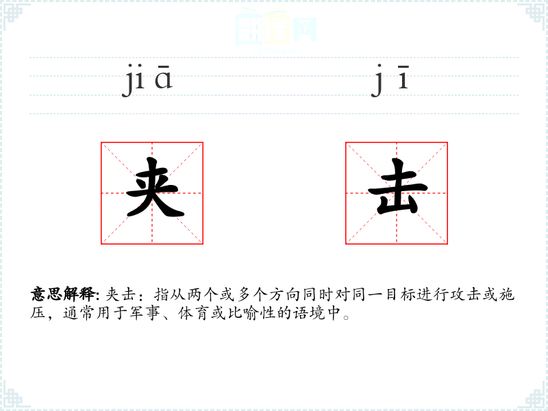 - 专业领域:在军事策略中,夹击是一种常见的战术,旨在通过多方向的攻击迫使敌人分散防御力量。