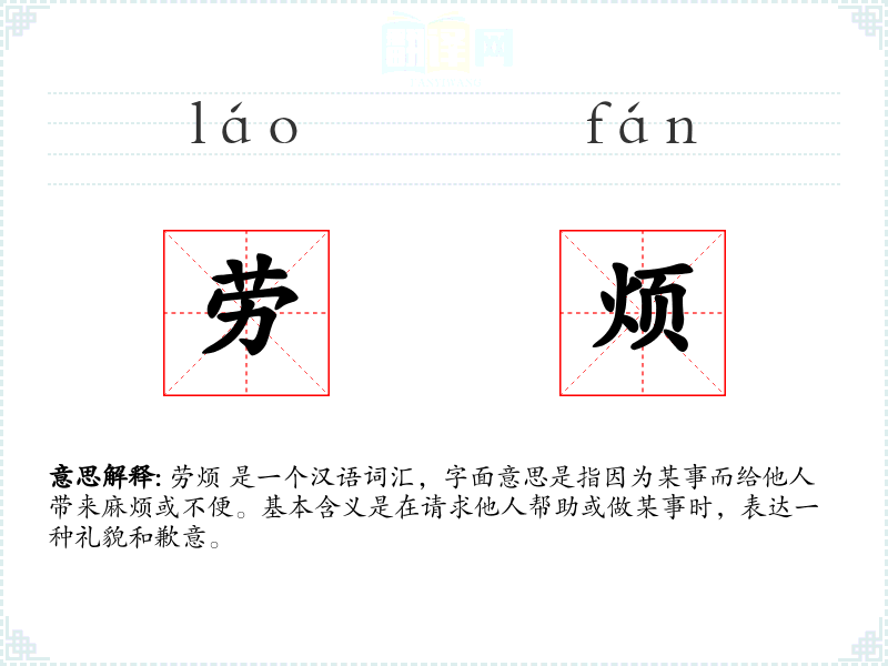 劳烦 是一个汉语词汇,字面意思是指因为某事而给他人带来麻烦或不便。基本含义是在请求他人帮助或做某事时,表达一种礼貌和歉意。