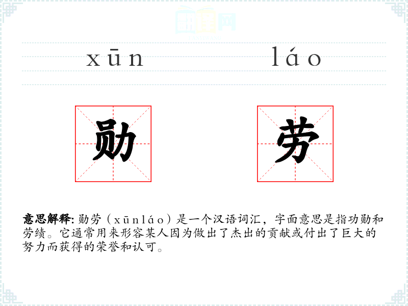 勋劳(xūn láo)是一个汉语词汇,字面意思是指功勋和劳绩。它通常用来形容某人因为做出了杰出的贡献或付出了巨大的努力而获得的荣誉和认可。