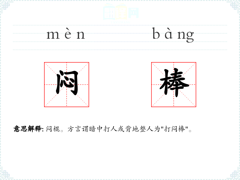 闷棍。方言谓暗中打人或背地整人为"打闷棒"。