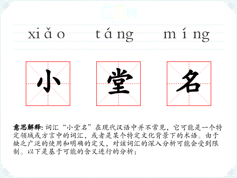 “小堂名”可能指的是一个小型堂会的名称,或者是指某个小型**场所、家族祠堂的名称。在某些方言或地区文化中,“堂名”可能指的是家族的姓氏或宗族的名称,而“小堂名”则可能是指分支或较小的家族单位。