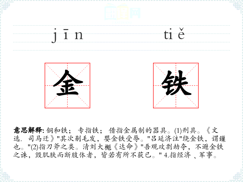 1.铜和铁; 专指铁; 借指金属制的器具。(1)刑具。《文选.司马迁》"其次剔毛发,婴金铁受辱。"吕延济注"绕金铁,谓鏁也。"(2)指刀斧之类。清刘大櫆《达命》"吾观攻剽劫夺,不避金铁之诛,毁肌肤而断肢体者,皆若有所不获已。" 4.指经济﹑军事。