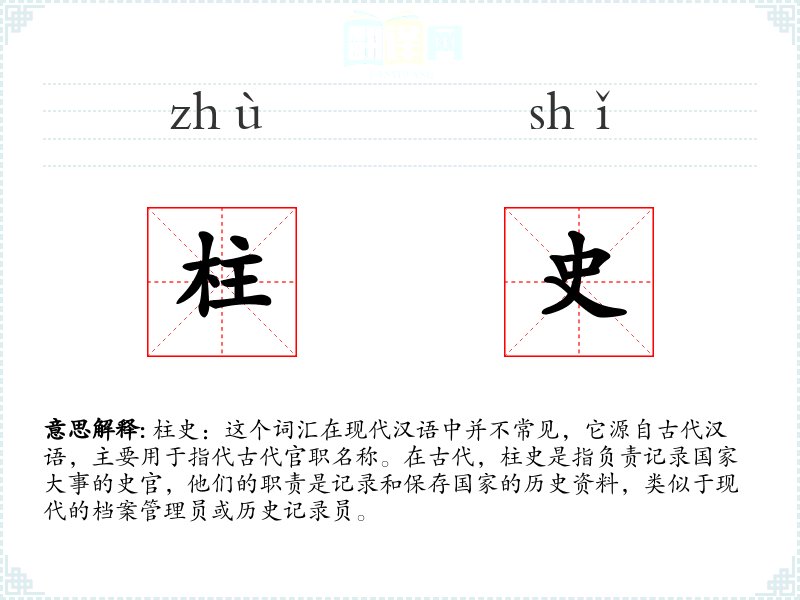 柱史:这个词汇在现代汉语中并不常见,它源自古代汉语,主要用于指代古代官职名称。在古代,柱史是指负责记录国家大事的史官,他们的职责是记录和保存国家的历史资料,类似于现代的档案管理员或历史记录员。