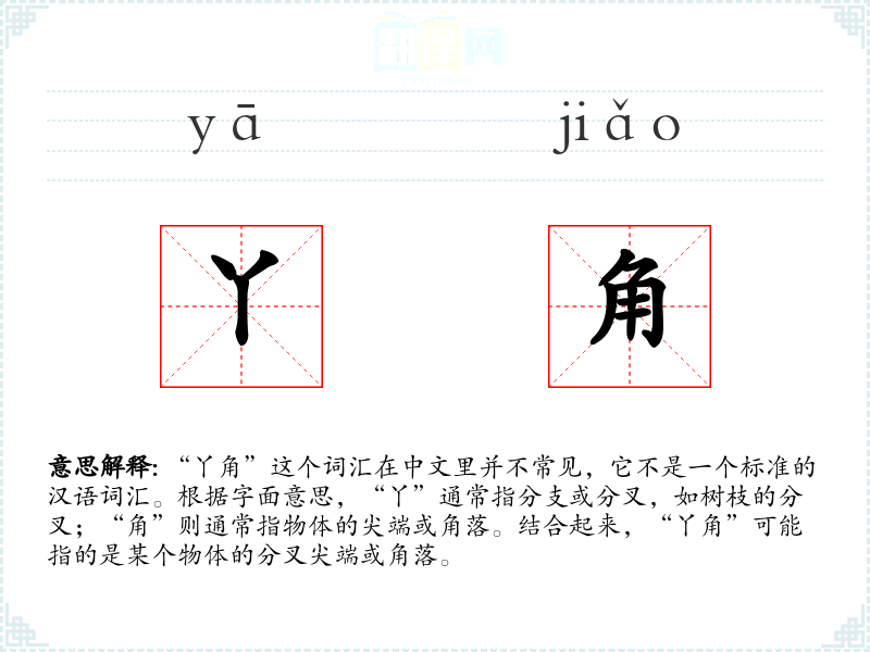 “丫角”这个词汇在中文里并不常见,它不是一个标准的汉语词汇。根据字面意思,“丫”通常指分支或分叉,如树枝的分叉;“角”则通常指物体的尖端或角落。结合起来,“丫角”可能指的是某个物体的分叉尖端或角落。