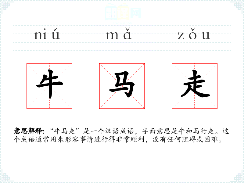 “牛马走”是一个汉语成语,字面意思是牛和马行走。这个成语通常用来形容事情进行得非常顺利,没有任何阻碍或困难。
